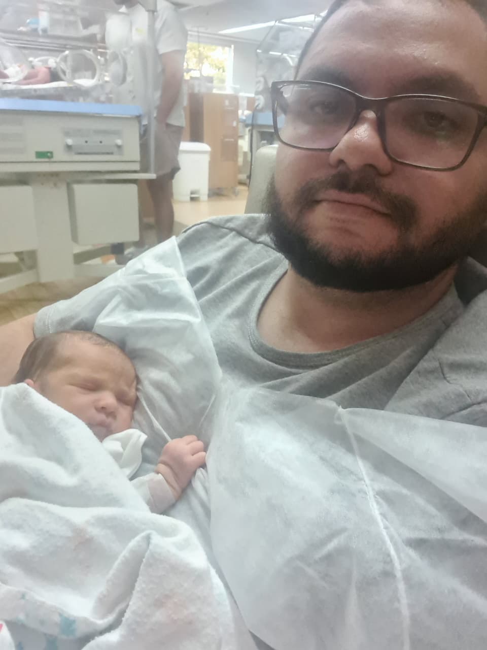 Ernani Padilha com o filho, que precisou ficar internado 8 dias na UTI Neonatal por conta de uma Hip