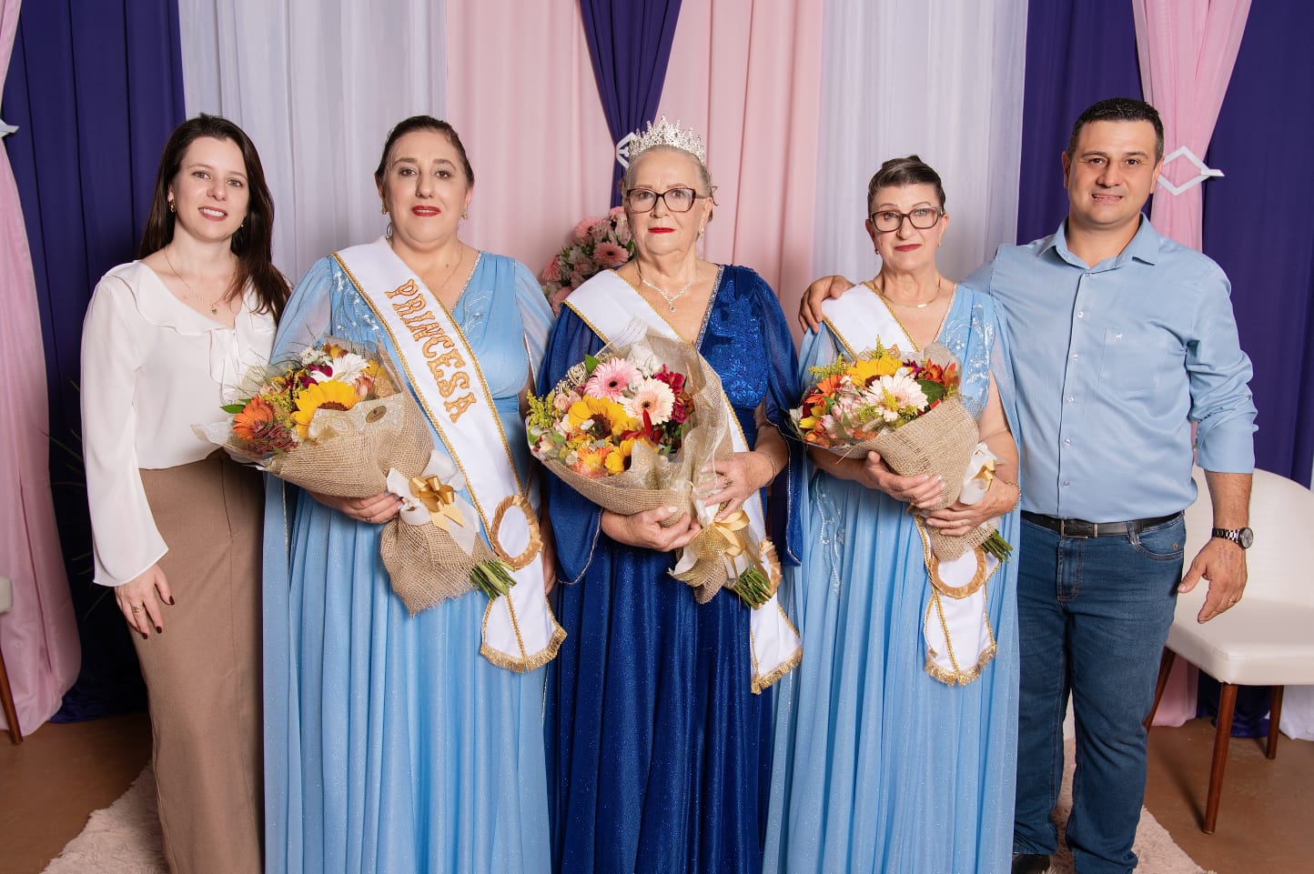 Na sequência, ocorreu a coroação da nova corte da Terceira Idade para o período 2026–2027, formada por Marilene Spada (rainha), Marlene Scarmignani Gutt (princesa) e Marlene Libera Terribile (princesa). As eleitas receberam faixa, coroa e flores das mãos das autoridades, em ato simbólico de reconhecimento à participação no grupo e à atuação junto à comunidade.