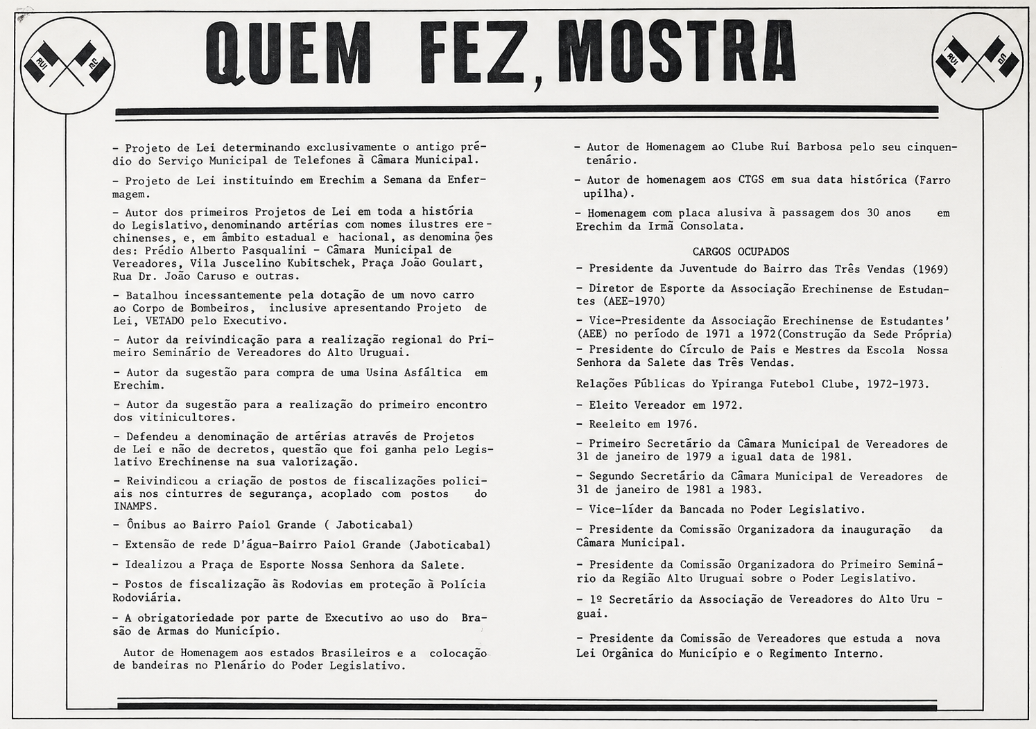 Entre suas iniciativas, também se destacam propostas voltadas ao desenvolvimento urbano e social, como a criação de espaços esportivos, incentivo à cultura, fortalecimento do cooperativismo e atenção a áreas como saúde e educação. Sua atuação acompanhou um período de transformação de Erechim, marcado pela expansão urbana e pela consolidação de serviços públicos.